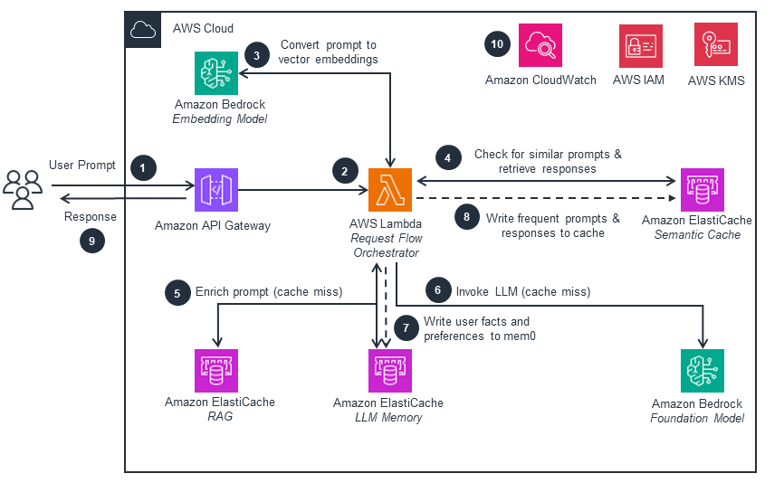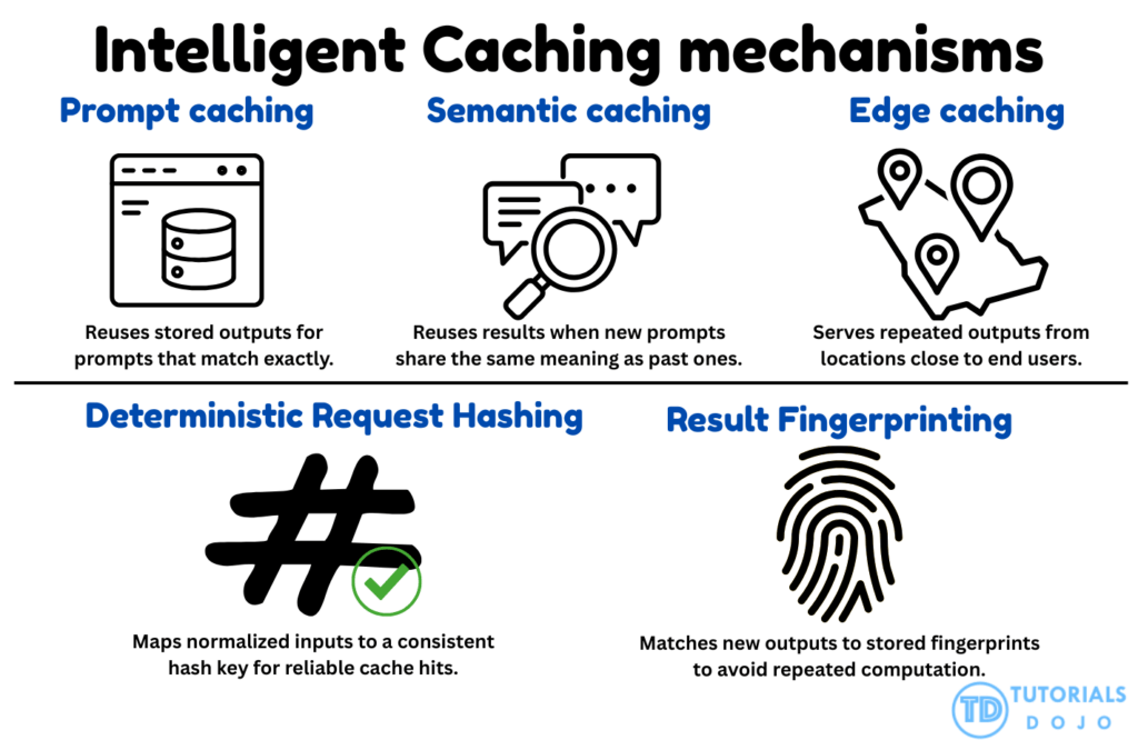 - Prompt Caching is a straightforward yet powerful strategy that stores responses from previously executed prompts. AWS architectures often implement this technique using low-latency data stores such as Amazon DynamoDB or in-memory caches like Amazon ElastiCache. When the system encounters an identical prompt in the future, the cached response is returned instantly rather than performing a new inference call. This approach is especially effective in generative AI workloads where users frequently submit recurring queries or template-based prompts, allowing the platform to reduce unnecessary compute activity and improve overall responsiveness.