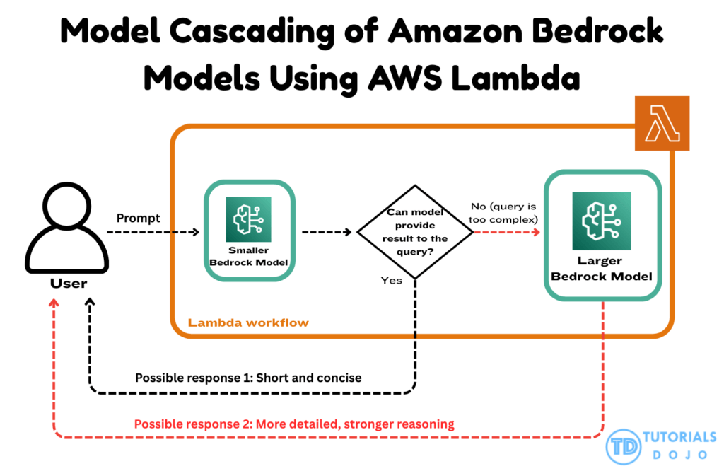 - This pattern is particularly effective because it minimizes costs by using the larger model only when necessary while keeping latency low for routine interactions. AWS Lambda enables this cascading flow by orchestrating the decision logic between multiple Bedrock models in a serverless, event-driven manner.