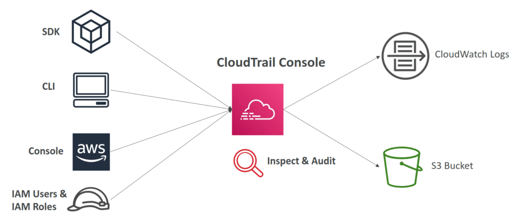 - Can put logs from CloudTrail into CloudWatch Logs or S3
