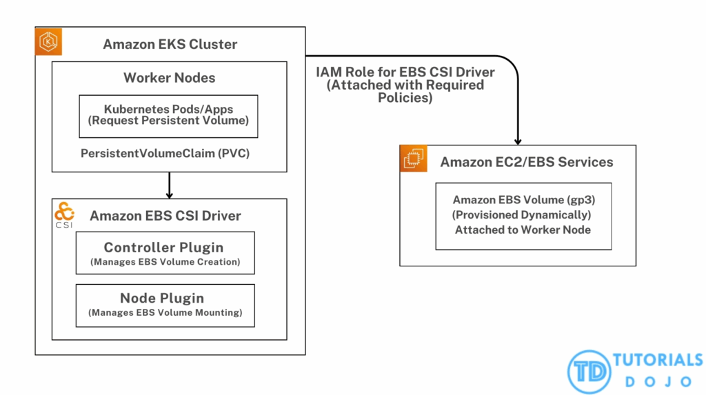 - The Amazon EBS Container Storage Interface (CSI) driver is responsible for integrating Kubernetes with EBS, enabling dynamic provisioning and management of volumes as per application requirements.