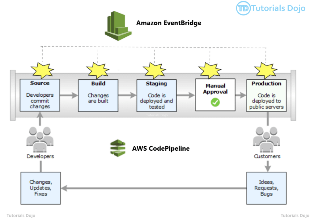 - EventBridge event bus events — You can monitor CodePipeline events in EventBridge, which detects changes in your pipeline, stage, or action execution status. EventBridge routes that data to targets such as AWS Lambda and Amazon Simple Notification Service.