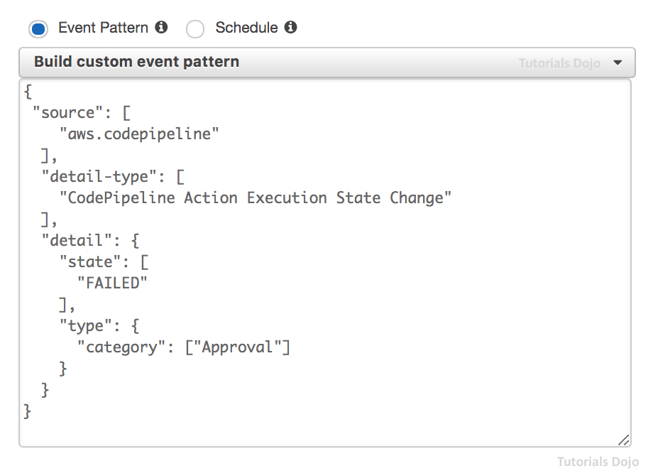 "detail-type":"CodePipeline Stage Execution State Change". - Specified actions or all actions, within a specified stage or all stages, within a specified pipeline or all your pipelines. You control this by using