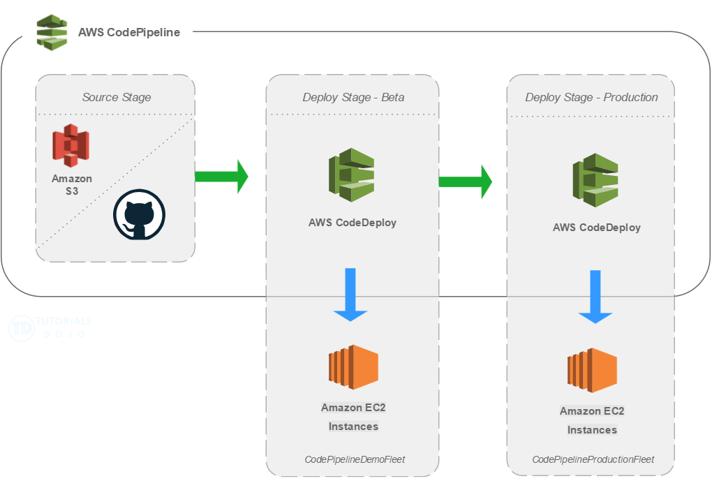 In designing your CI/CD process in AWS, you can use a single repository in GitHub (or GitLab) and create different branches for development, master, and release. You can use CodeBuild to build your application and run tests to verify that all of the core features of your application are working. For deployment, you can either select an in-place or blue/green deployment using CodeDeploy.