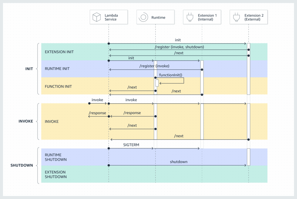 - Lambda extensions come in two flavors: external and internal. The main difference is that an external extension runs in a separate process and is allowed to run longer to clean up after the Lambda function terminates, whereas an internal one runs in-process.