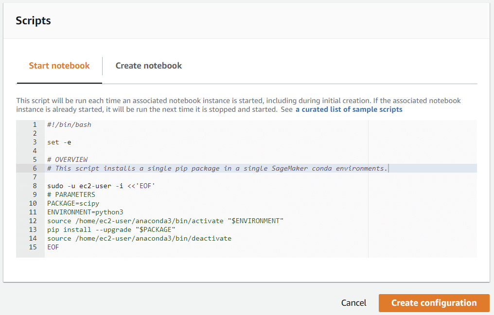 - A lifecycle configuration (LCC) provides shell scripts that run only when you create the notebook instance or whenever you start one. When you create a notebook instance, you can create a new LCC or attach an LCC that you already have. Lifecycle configuration scripts are useful for the following use cases: